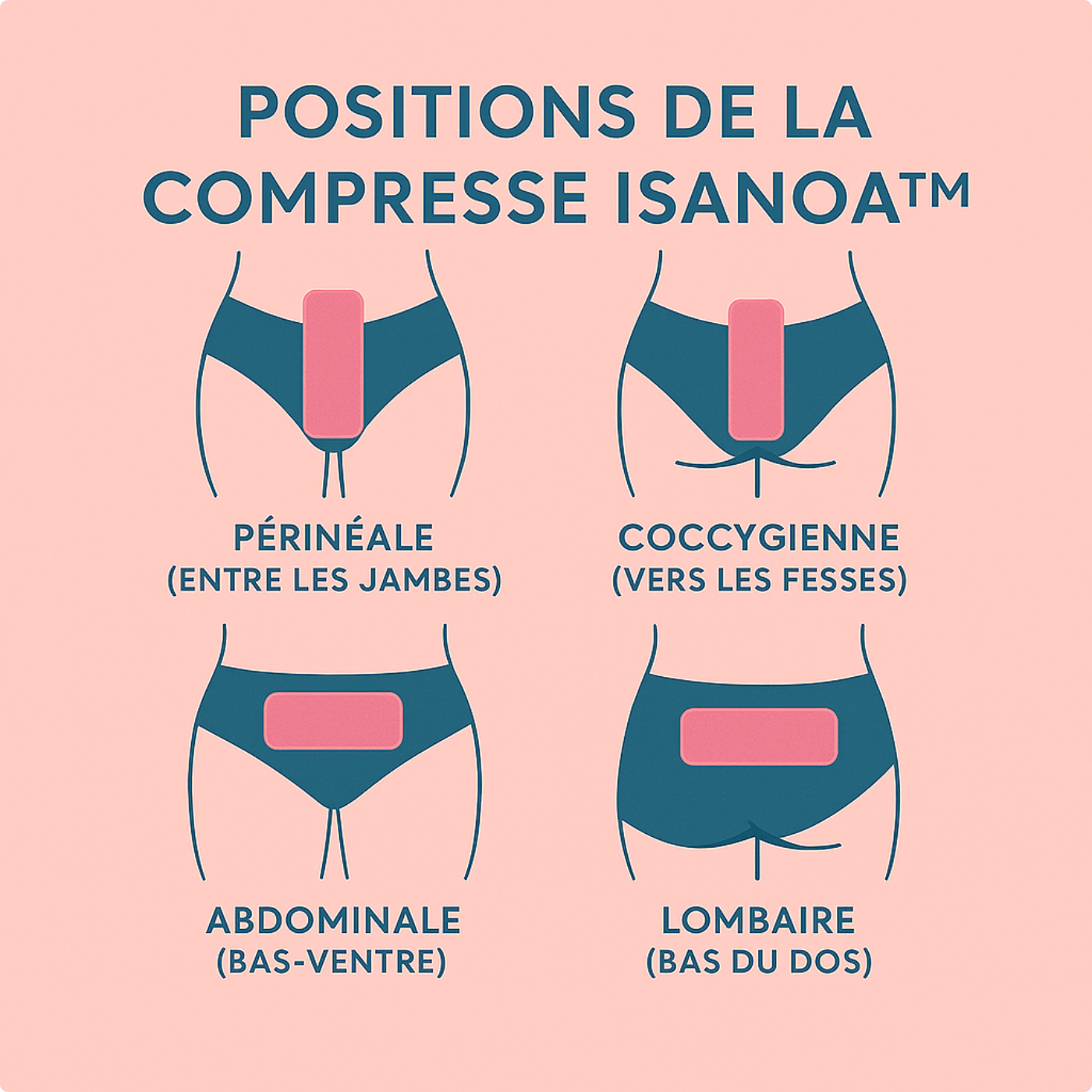 Grâce à sa forme rectangulaire souple et ergonomique, la compresse Isanoa™ s’adapte parfaitement aux douleurs les plus fréquentes du post-partum : le périnée, le coccyx, le bas-ventre (post-césarienne) et le bas du dos. Elle offre un soulagement naturel des douleurs post-accouchement, qu’elles soient liées aux points de suture, aux hémorroïdes, aux contractions utérines ou aux tensions lombaires. Réutilisable, elle s’utilise aussi bien chaude que froide selon vos besoins. Un petit geste, pour un grand soulagement.