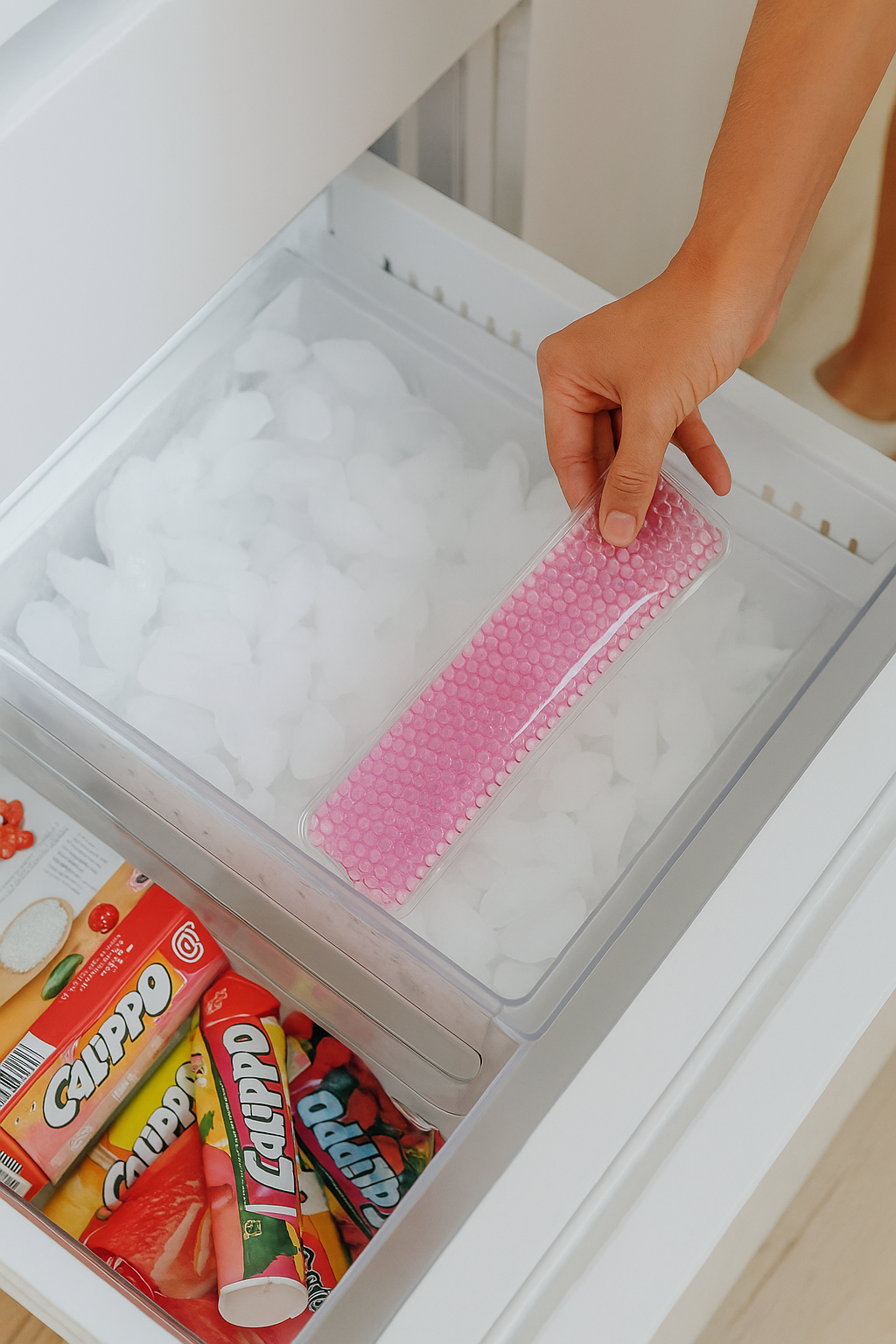 - Place la compresse (sans housse) au moins 3o minutes au congélateur. Pour un meilleur effet entre 2 et 6 heures